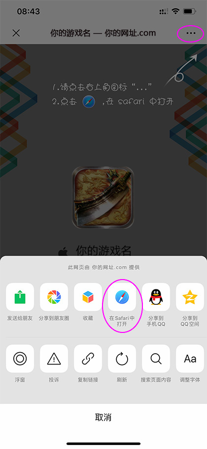 第一步 点击右上角…,选择在 Safari中打开,如图:
